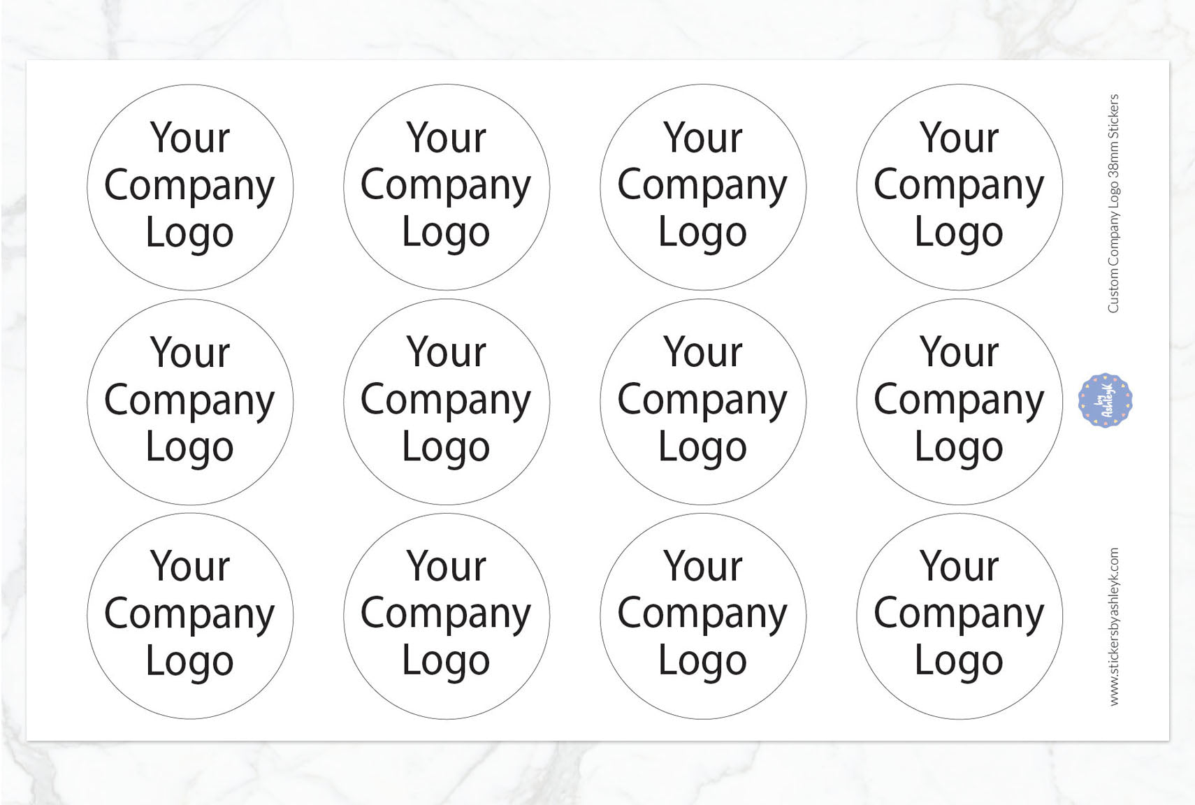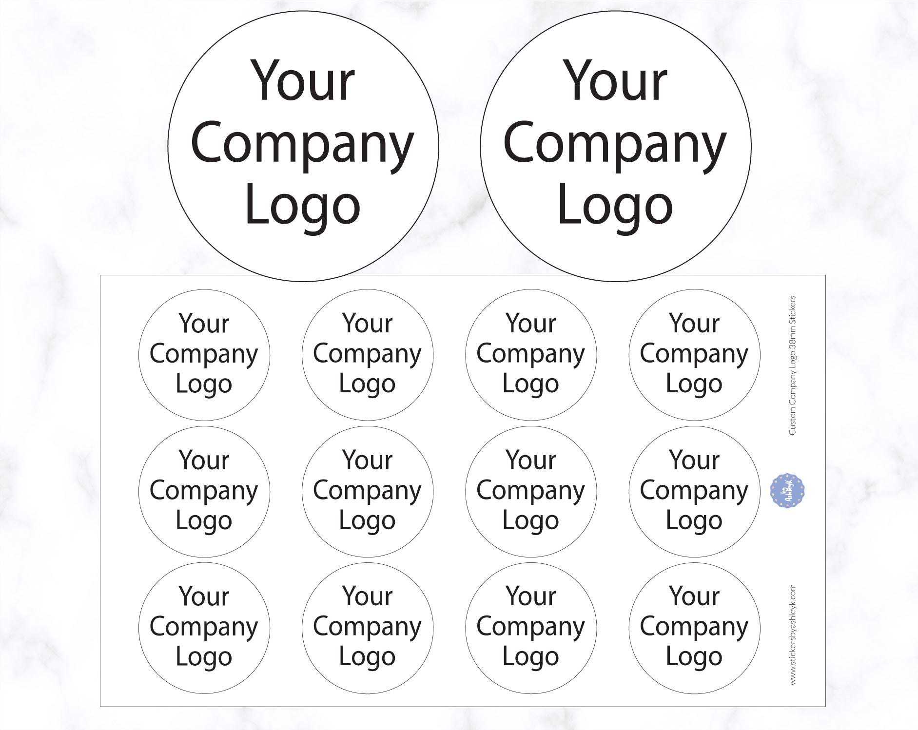 These custom company logo stickers - 38mm diameter have been designed by AshleyK to complement your sales packaging or personal thank you cards and gifts.