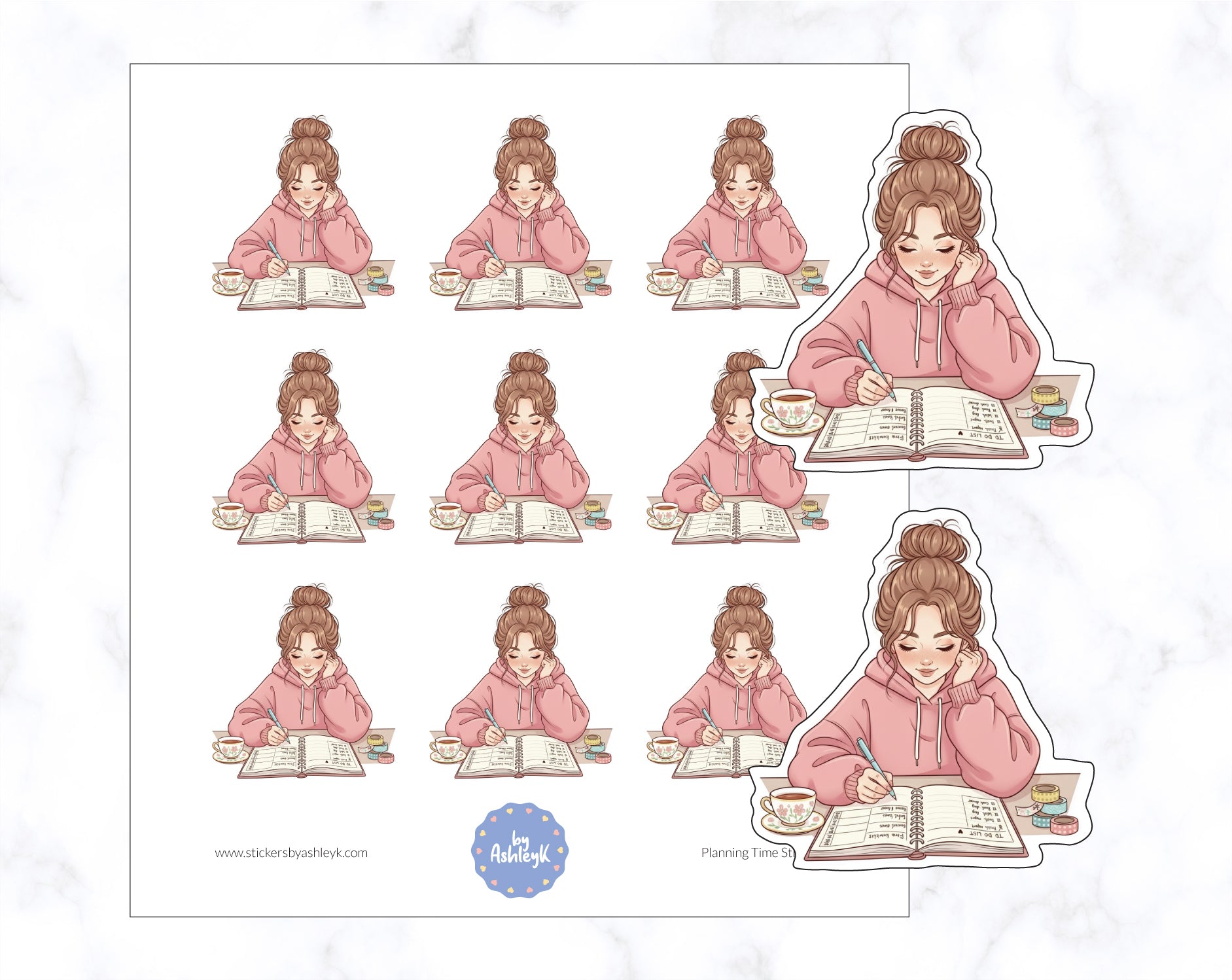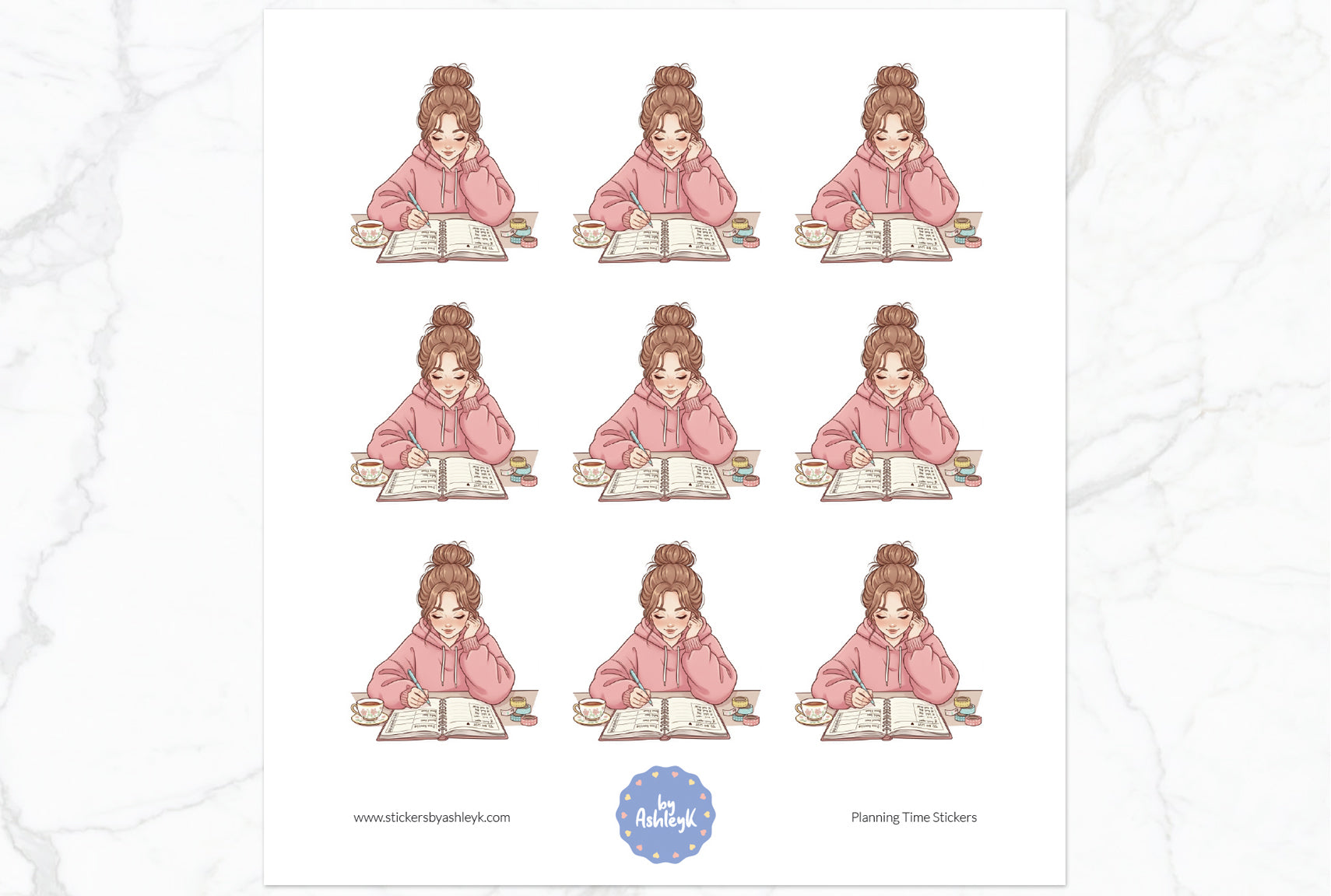 These adorable planning time stickers are the perfect way to add a touch of cuteness to your planner or journal. Featuring a sweet girl focused on writing, they capture the peaceful and productive feeling of organising your day. The pastel tones and charming art style will brighten up any page and make your to-do lists more enjoyable. Use them to mark important planning sessions or simply to decorate your weekly spreads. Get organised in style and make your planning time feel extra special!