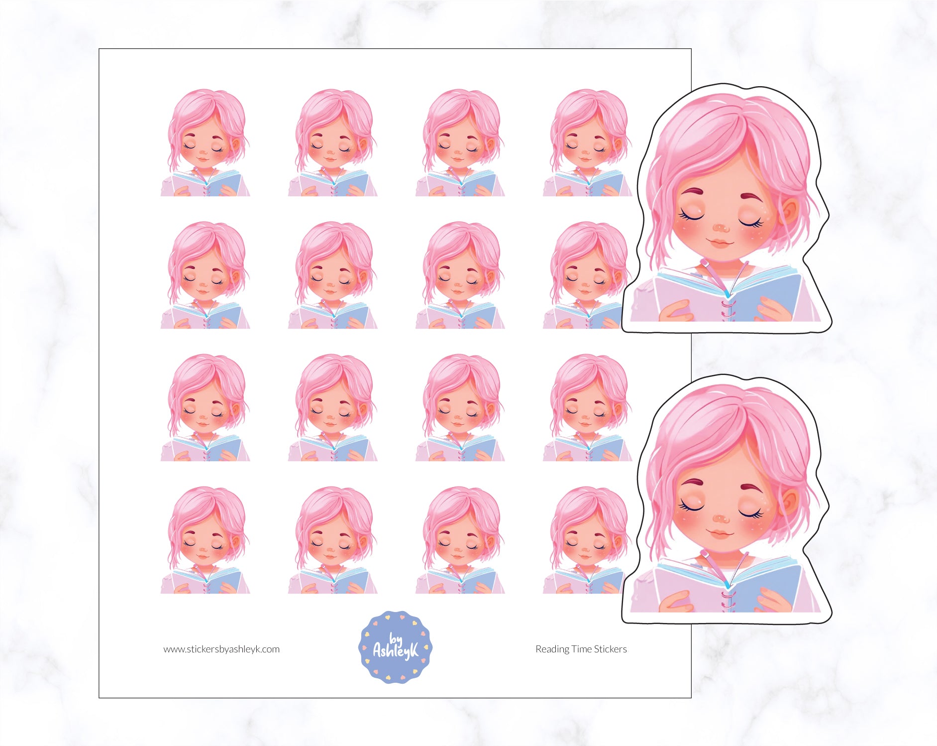 Cozy up your planner with these charming Reading Time stickers, featuring a sweet pink-haired girl lost in her book. Perfect for marking quiet reading sessions, book club days, or relaxing me-time in your schedule. The soft pastel tones and peaceful expression add a calming touch to any planner layout. Ideal for book lovers and anyone who enjoys moments of stillness and imagination. Make your planning routine more mindful and magical—one page at a time.