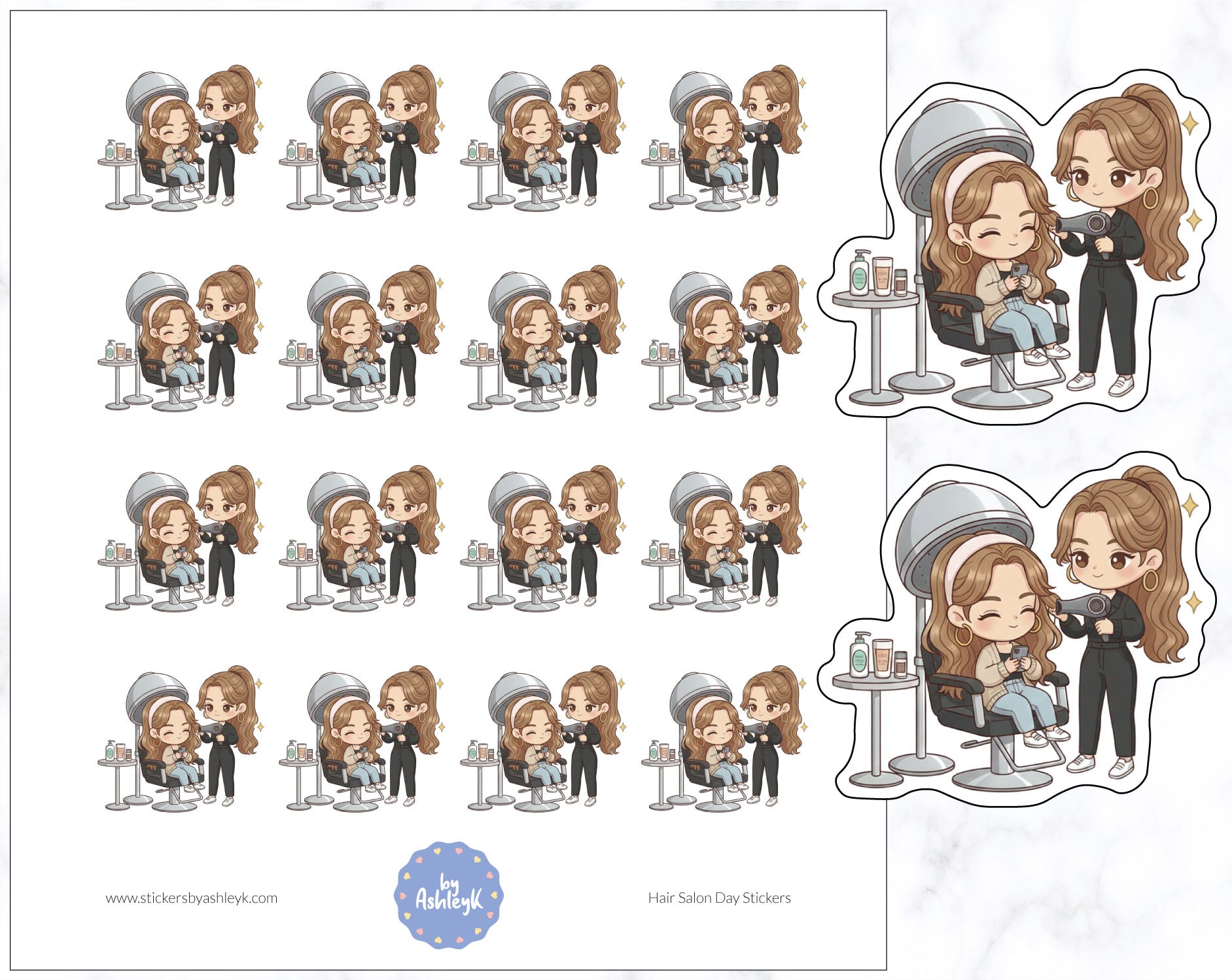 Make sure your next beauty session is locked in with my adorable Hair Salon Day Planner Stickers! These essential stickers feature a cute girl enjoying a visit to the hairdresser, making it easy and visually appealing to track your hair appointments. Use them to clearly mark your next cut, colour, or style day in your planner or calendar. Prioritise your self-care and ensure your hair always looks its best by keeping these key dates neatly organised!