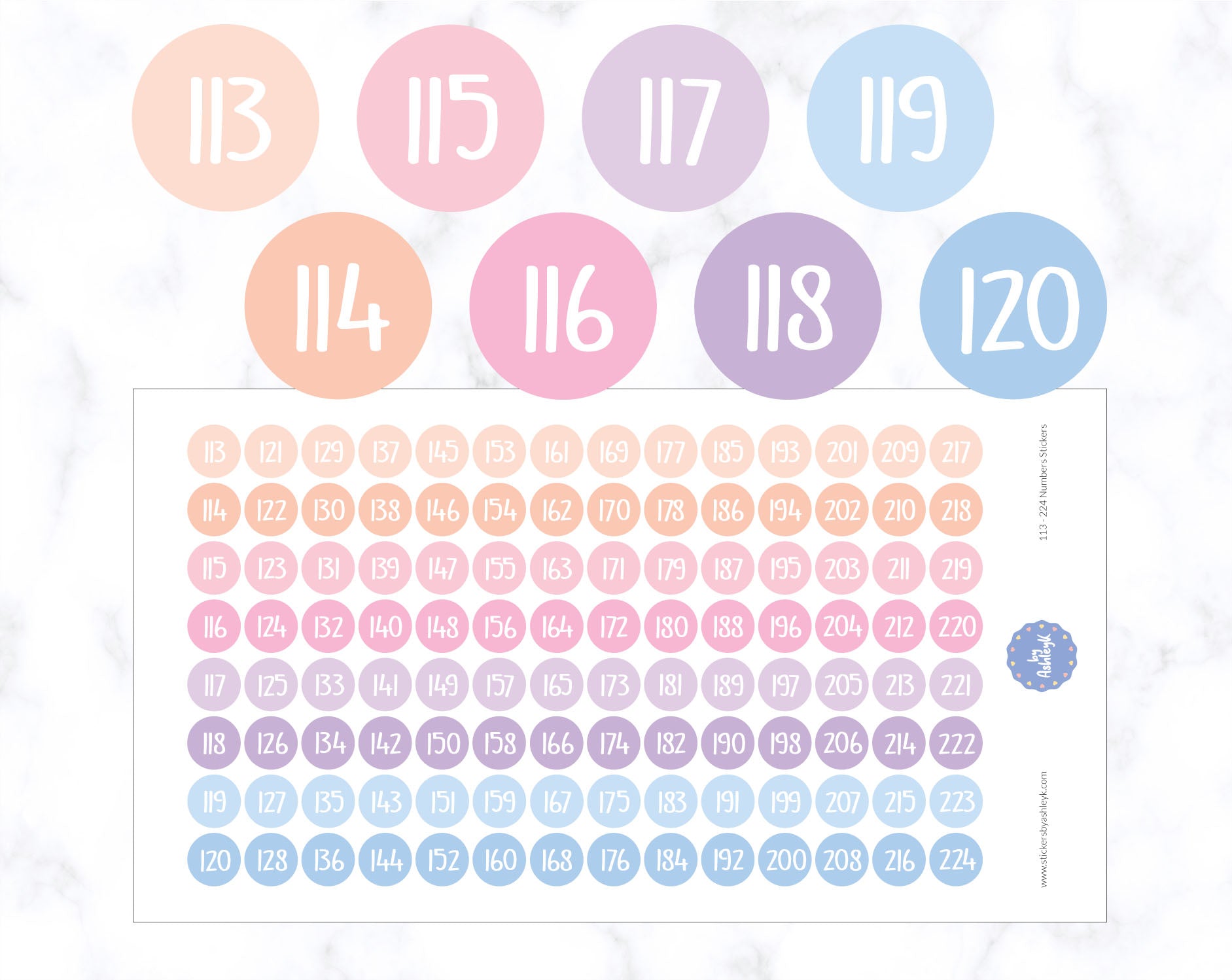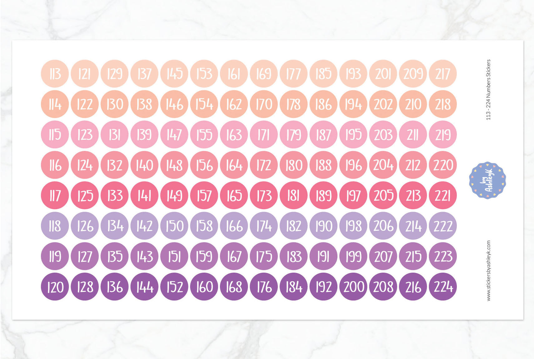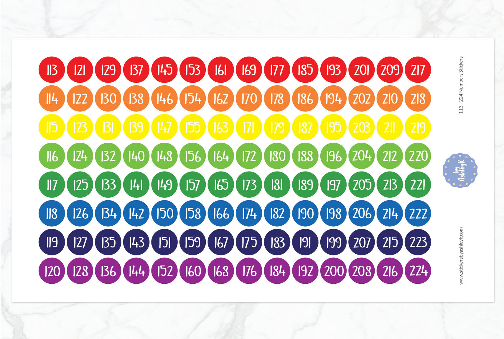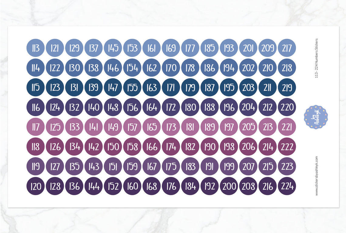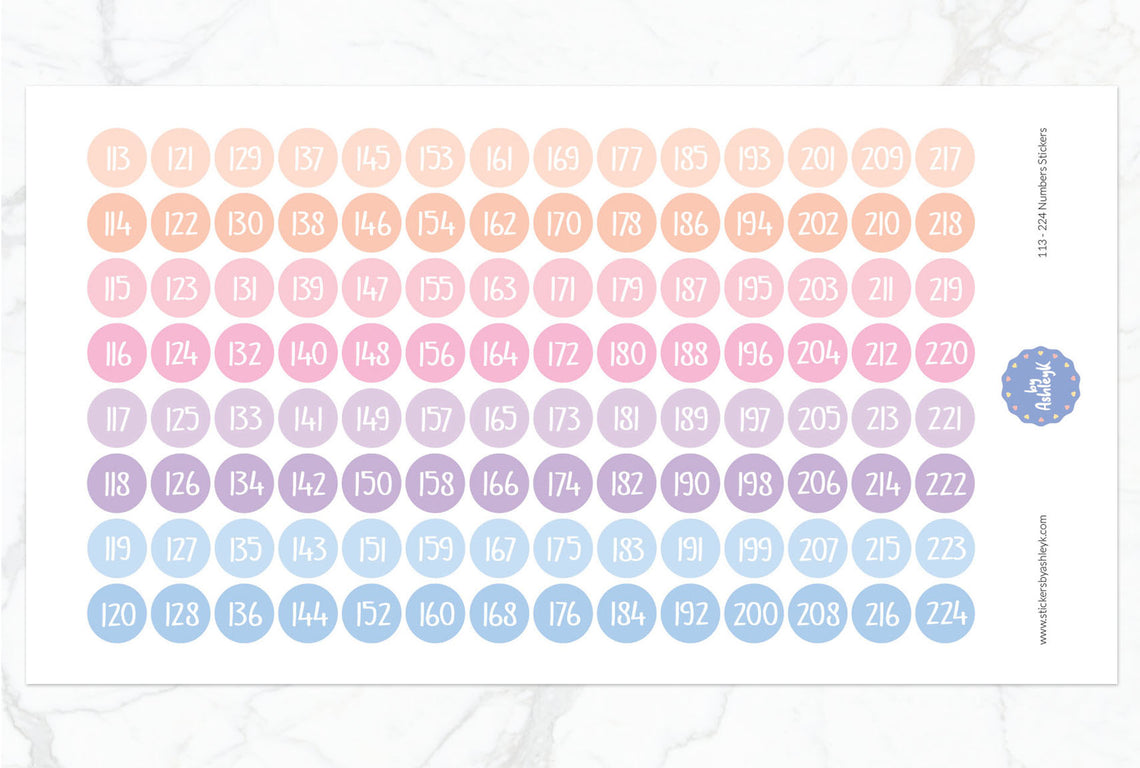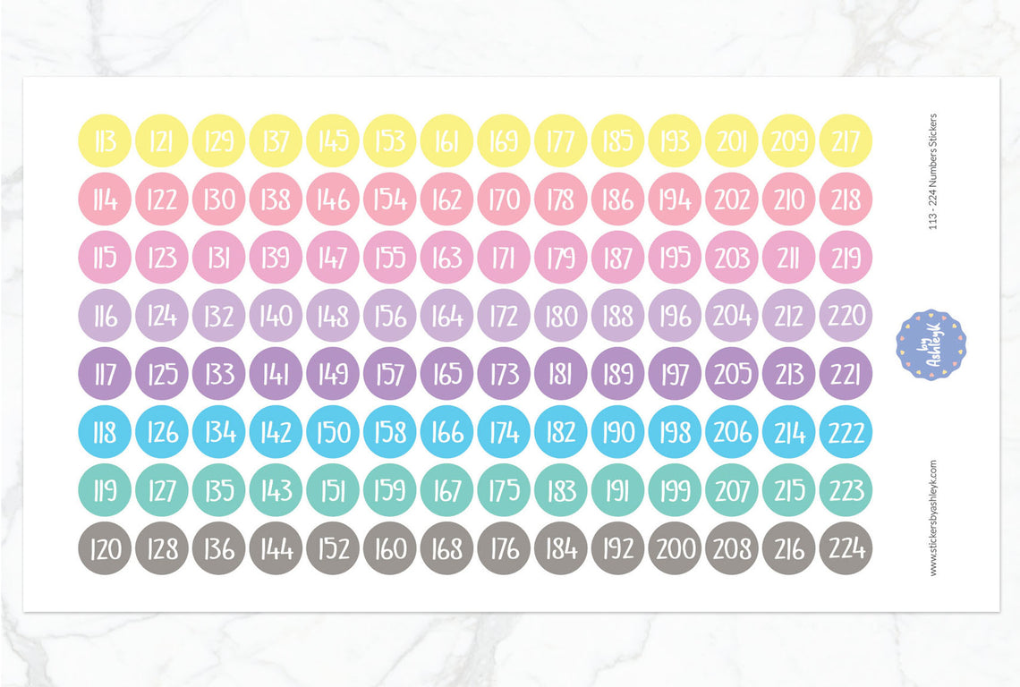 Organise and label with ease using this set of number stickers ranging from 113 to 224. Perfect for inventory, storage, classrooms, or crafts, these self-adhesive stickers offer clear, bold numbering for quick identification.