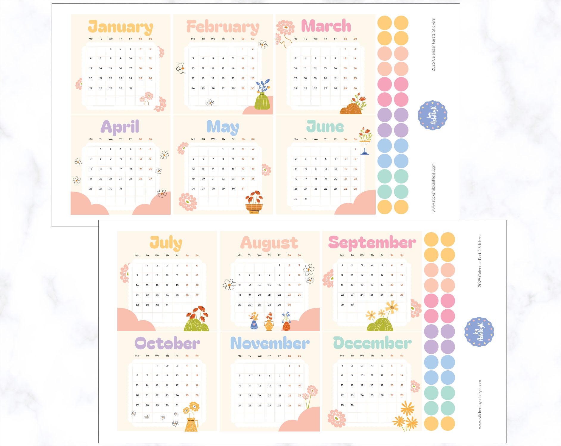 Each sticker showcases a full monthly mini calendar from January to December 2025, adorned with delicate floral accents in gentle, soothing tones. Perfect for bullet journals, planners, scrapbooks, or wall calendars, these stickers help you stay organised while bringing a fresh, elegant look to every page.